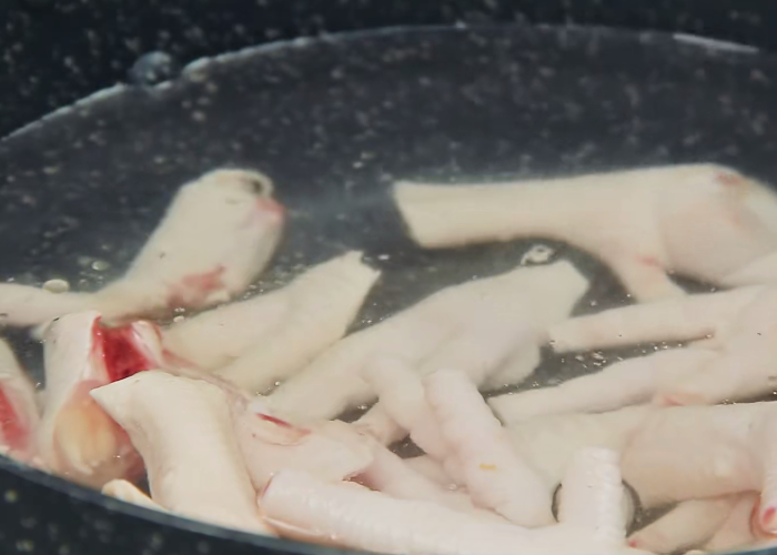 第二步:锅中加入350ml的清水,把准备好的鸡爪倒入其中,加入三片老姜和一勺料酒,稍微搅拌几下后,盖上盖中火焖煮六分钟,取出洗净控干备用。