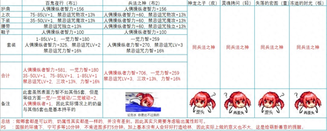 我们可以看到,除了皮甲有明显智力上的差距,其他4件除了太阳外基本持。平一般情况下这样的装备在满技能宝珠,有宠物有光环,称号是2级太阳称号的情况下,实时太阳等级能够达到23级(估计现在绝大部分玩家没有去年的国庆光环,有的话能达到24级,即起始极限太阳等级)。而实际上起始太阳等级达到22级的时候,轻布的太阳加成就已经比板重要高了…因此,打造完美的情况看来,轻布实际奶量其实已经超过了板重。当然,即便是超过也是非常非常细微的差距。综合上面给出的超界防具排名为:轻=布≥板=重>皮。当然,防具之间的差距并不大,或者可以说是忽略不计,所以不必太过于纠结防具方面的选择情况。人人都可以拥有一套超界防具,真正的差距还是细节与打造所拉开的。