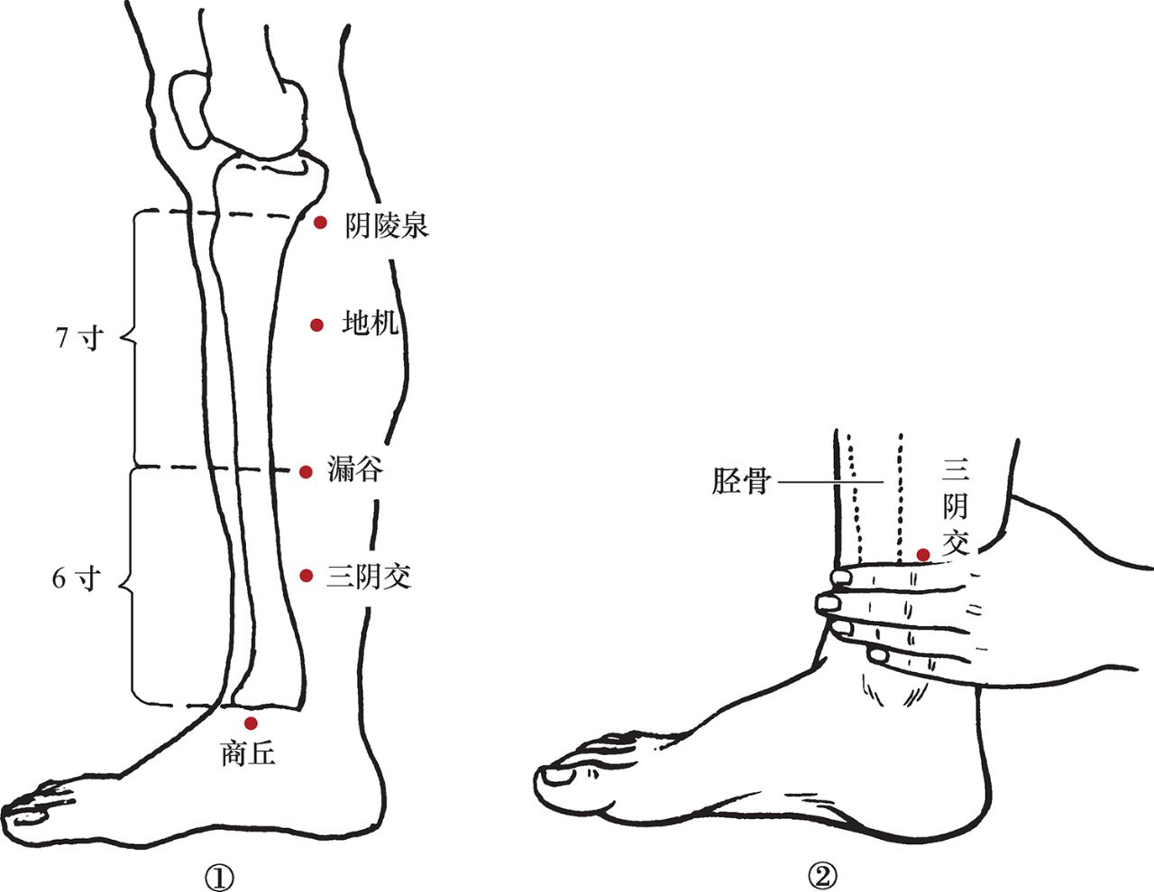 三阴交:正坐或仰卧,于胫骨内侧面后缘,内踝尖间直上4横指(一夫)处取穴。从内向外直刺0.5~1寸。