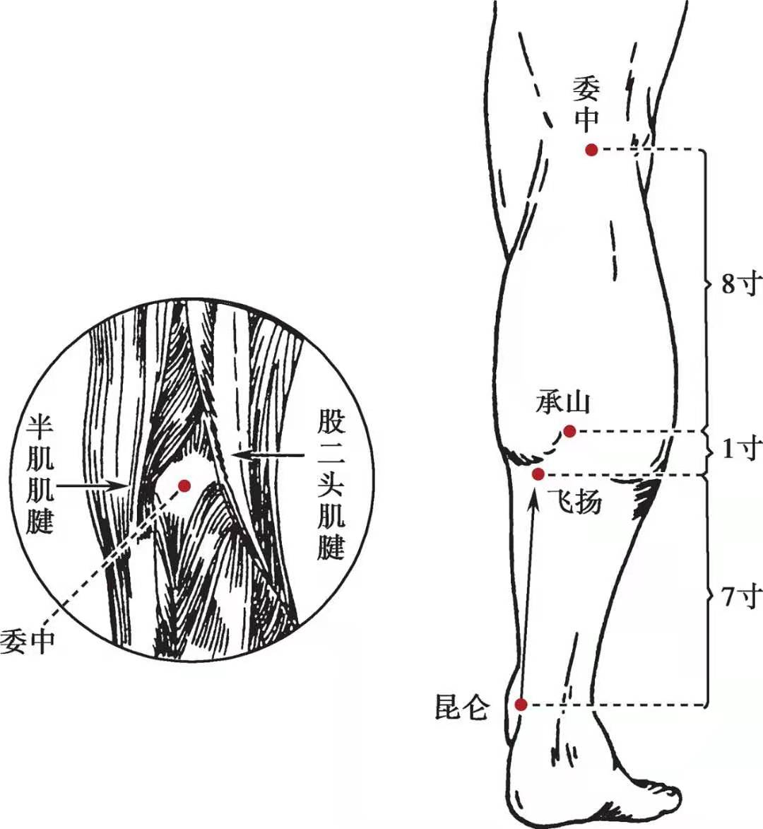 承山:①俯卧,下肢伸直,足跖挺而向上,其腓肠肌部出现”人”字陷纹,从其尖下取穴;②直立,两手上举按着墙壁,足尖着地,在腓肠肌下部出现”人”字陷纹,当”人”字尖下取穴。直刺0.8~1.2寸。