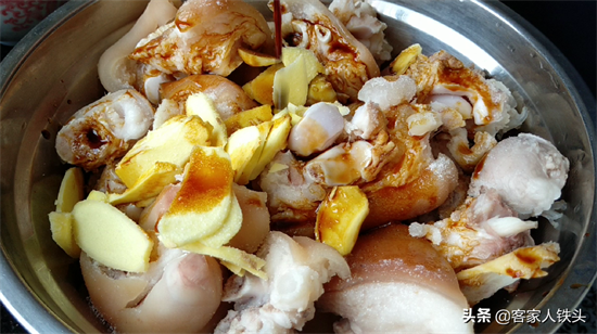 第三步:猪脚焯水后,再次清洗一遍,洗去表面粘上的浮沫,然后加上姜片,适量盐、生抽、把它搅拌均匀,腌制20分钟。