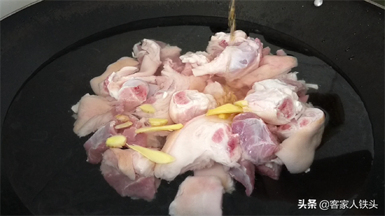 第二步:准备一只猪手(就是猪前脚),清理干净表皮,然后砍成块清洗干净,冷水下锅焯一下水,放上几块姜片,一小勺料酒。