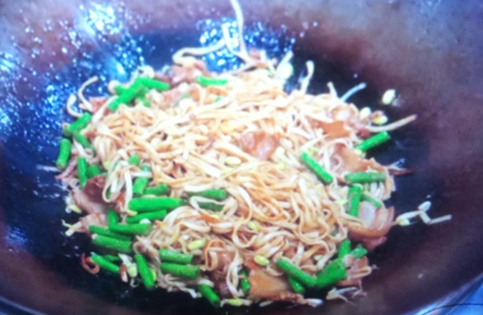 4.在加豆角段炒至变色,添高汤200克,在调入精盐3克,鸡粉2克,十三香3克,蚝油5克,东古一品鲜酱油5克,大火烧开后关火。倒入蒸好的面条,快速翻炒均匀,在倒入托盘摊平蒸制20分钟即可走菜。