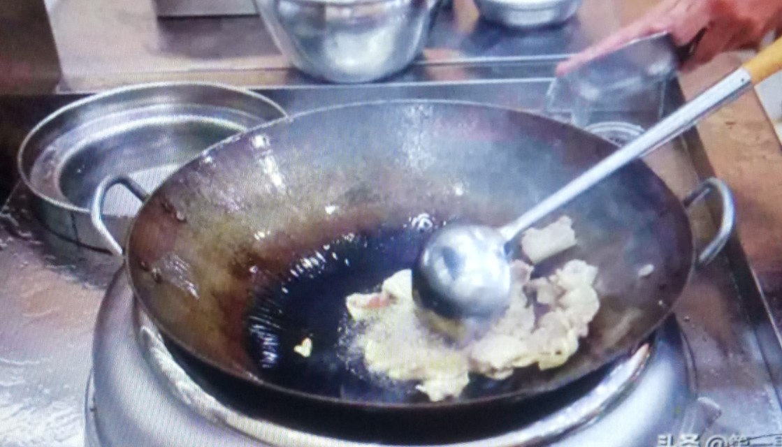 3.锅中放入大豆油100克烧热,下猪肉片煸香,在倒入葱段姜丝各10克小火炒香。