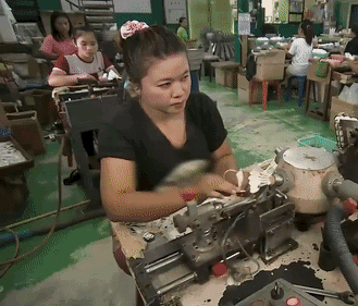 比如,在这个东南亚的工厂里,工人手工把一顺边的羽毛放到一个分拣机里面。