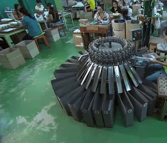 不过,羽毛是手工放入机器的,所以工人的手速必须和机器协调一致。