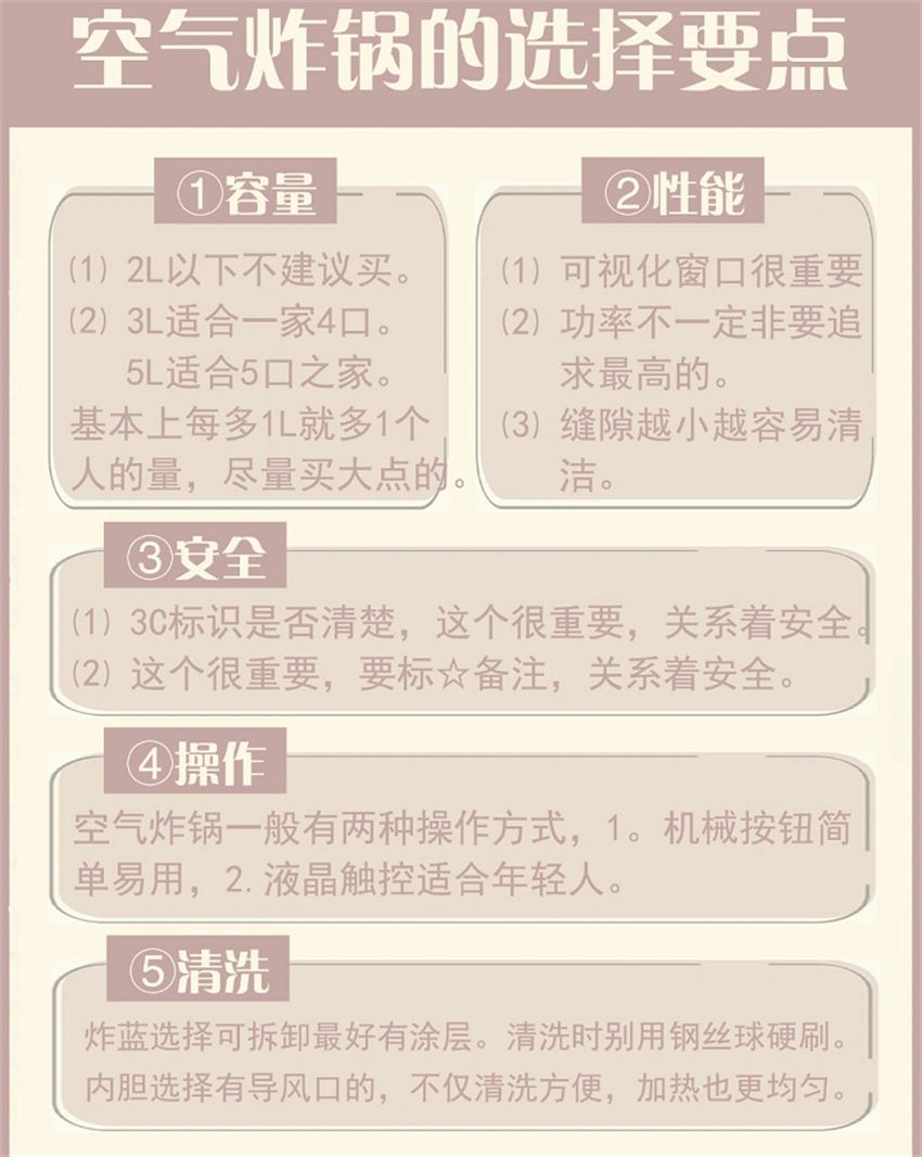 最后分享给大家几条选购空气炸锅的技巧,有需要的可以参考。