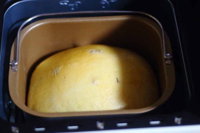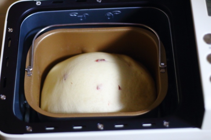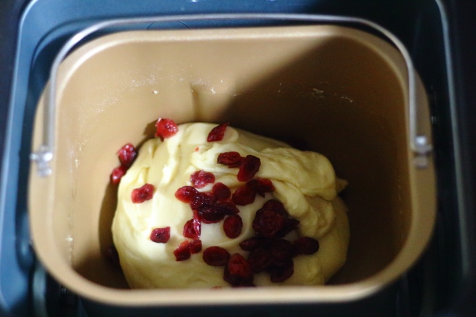 8、第3个揉面和醒面程序结束后直接进入第4个揉面程序,此时LCD显示屏上揉面状态显示为4,手机中查看状态时也显示为4,在这个过程中会听到面包机发出滴滴的响声,此时加入提前浸泡过的蔓越莓干,蔓越莓使用之前先用温水浸泡半小时,然后用厨房用纸吸干表面的水分后再放入面包机中;