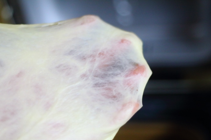 7、大约20分钟左右后,第3个揉面程序和醒面程序结束后从面包桶中取一小块面团,能拉出透明的手套膜;