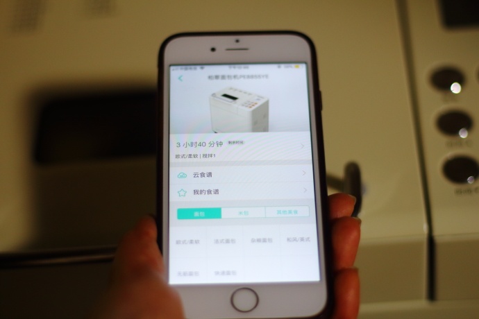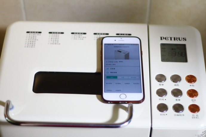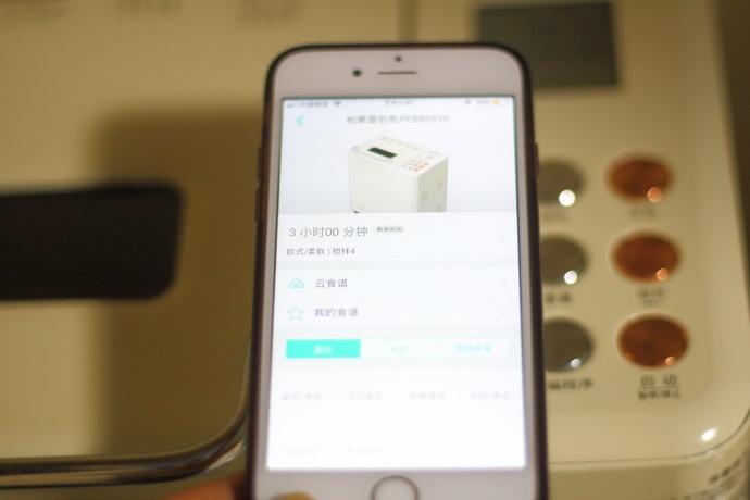 3、材料准备好之后将面包桶放入面包机底坐上安装好;接通电源,从操作面板上选择“欧式果料面包”对应数字1,再按启动键开始制作。或者打开手机中的阿里智能APP,连接wifi,在添加设备中添加PE8855面包机,与面包机建立连接后,启动面包机开始揉面,随后在手上中可以限时查看面包机的工作状态;