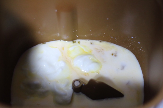 1、先准备好所需的食材,然后按先液体后粉状的顺序将鸡蛋、浓稠酸奶、牛奶、白砂糖分别称好重量放入面包机桶中;