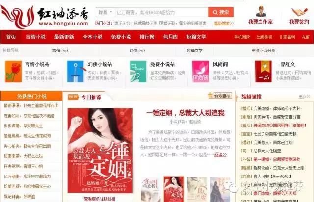 红袖添香(www.hongxiu.com)创办于1999年,是全球领先的女性文学数字版权运营商之一。红袖添香为用户提供涵盖小说、散文、杂文、诗歌、歌词、剧本、日记等体裁的高品质创作和阅读服务,在言情、职场小说等女性文学写作及出版领域具有巨大影响力。