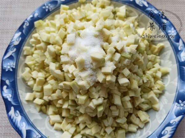 2、接着处理馅料部分,茄子清洗干净后,切成碎丁,加上一勺盐,翻拌均匀,腌制一会儿,攥干挤出多余的水分。