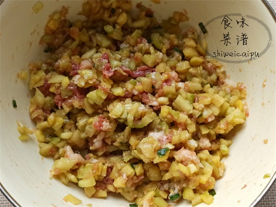 3、茄子出馅率低,一盆茄子杀完水分,攥干后只剩下一点,和肉馅搅拌均匀,先放在一边入味,馅饼部分制作完成。