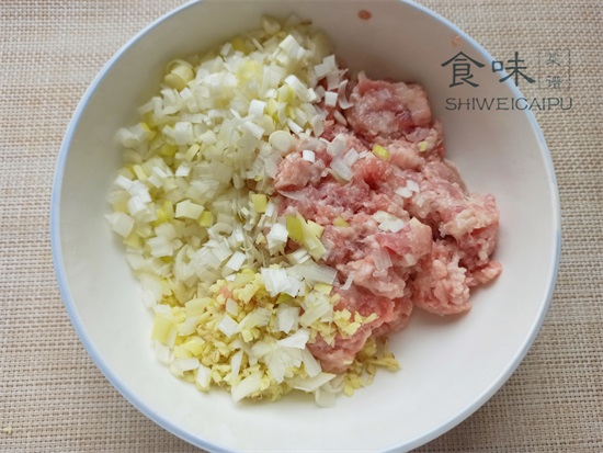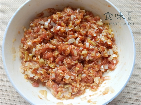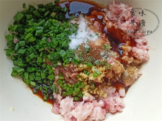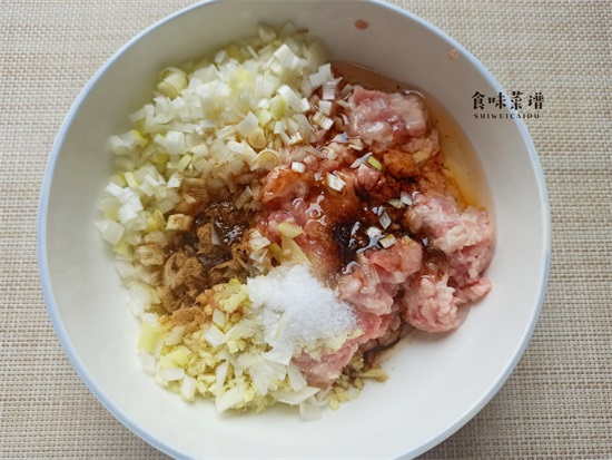 1、准备300克五花肉,三分肥七分瘦最佳,剁成肉馅,加入食盐、蚝油、葱姜末、胡椒粉、生抽、芝麻香油,顺着一个方向搅拌均匀。