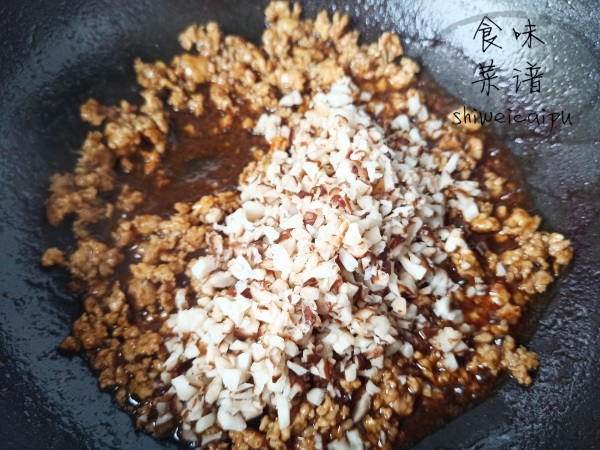 3、肉末炒散炒变色,下入半勺花椒粉、1勺料酒、1勺酱油,1勺蚝油、2勺黄豆酱,翻炒均匀后,倒入香菇丁,翻炒2分钟出锅。(
