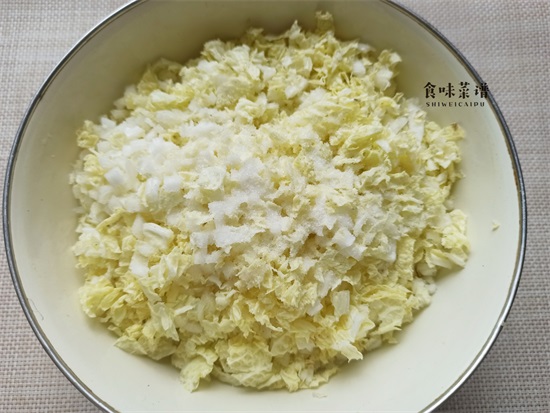 1、一颗白菜,扒掉无用的外层,保留鲜嫩的部分,剁成碎末,撒上一勺食盐,翻拌均匀,腌出内部的水分,大约十五分钟左右。