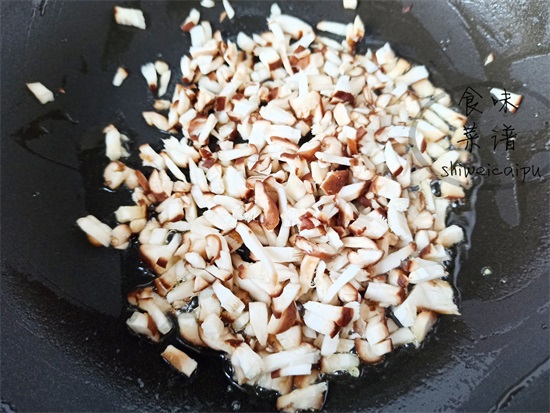 2、湿香菇直接切碎,干香菇需要泡发,沥干水分,切成小碎末,放进锅中炒至断生,时间很短就够了,装盘备用,蒸时可以缩短时间。