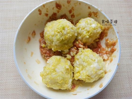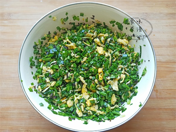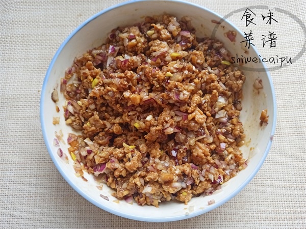 4、这个时候可以尝一尝味道,酌量增加食盐,到了这一步,馅料部分就制作完成,味道香喷喷的。