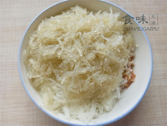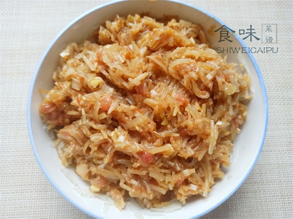 3、白萝卜擦成细丝,焯水2分钟捞出,用滤布攥干水,红薯粉条,下锅煮熟,捞出过一遍凉水,剁成1厘米碎末,将攥干水分的白萝卜,和剁碎的粉条,一并装进肉馅中,用筷子搅拌均匀。