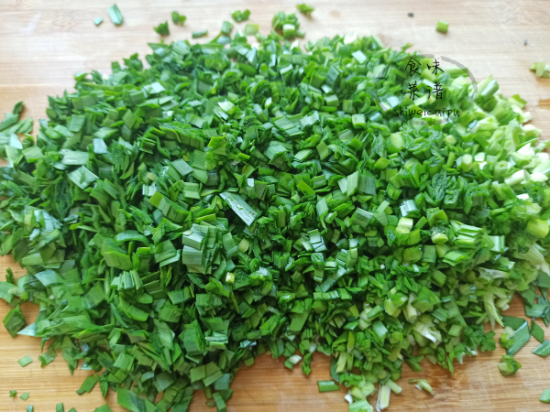 1、韭菜清洗干净,控干水分,剁成碎末,包韭菜馅最怕的就是出水,一定要控干再切。