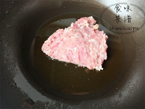 2、起锅烧油,将提前剁好的肉馅,放进锅中炒散,肉末部分建议,三分肥七分瘦,回家自己剁,炒至肉末变色。