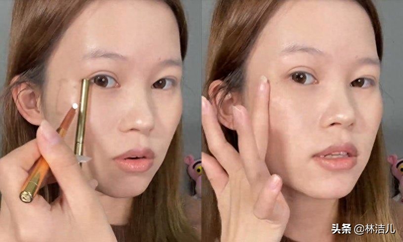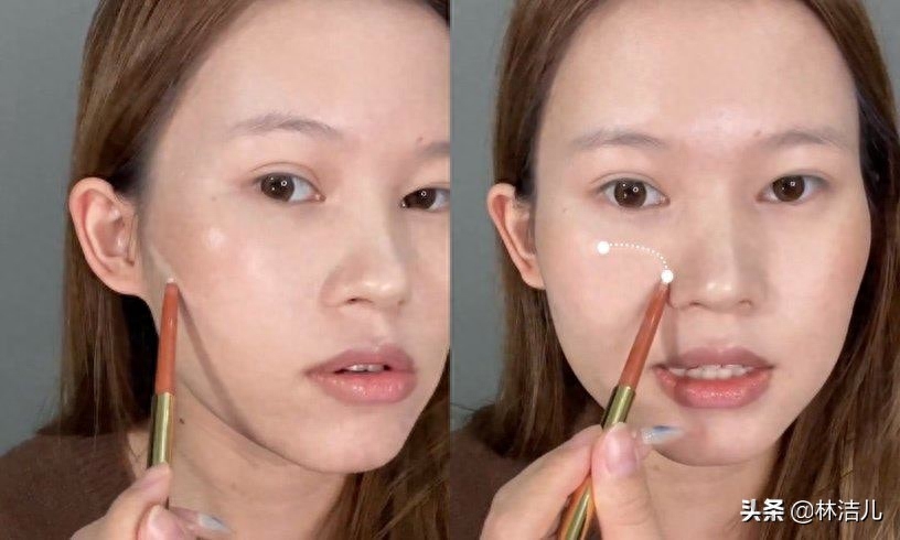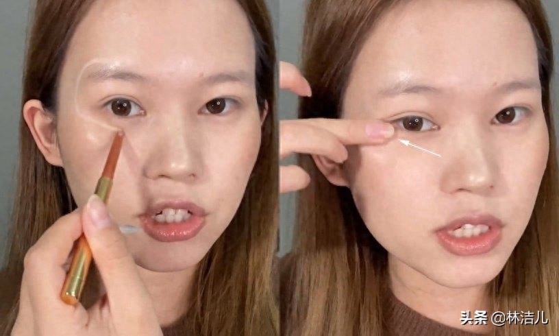 如果只是将太阳穴凹陷处提亮,一转到正面,填补凹陷处的效果可能就不明显了。因此正确的做法,就是要将提亮位置往前延伸。使用比肤色亮一个色号的遮瑕笔,从眉弓骨位置、画到眼眶骨,再延伸至眼下,接着使用手指轻拍晕染。这里要特别注意,眼下区域要沿着“斜上”的方向晕染,否则一不小心碰到颧骨,会让骨骼更凸出。