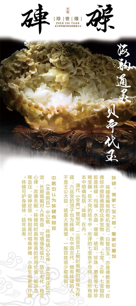 砗磲是稀有的有机宝石、白皙如玉,亦是佛教圣物。 砗磲是海洋贝壳中最大者,直径可达1.8m。砗磲一名始于汉代,因外壳表面有一道道呈放射状之沟槽,其状如古代车辙,故称车渠。后人因其坚硬如石,在车渠旁加石字。砗磲、珍珠、珊瑚、琥珀在西方被誉为四大有机宝石,在中国佛教与金、银、琉璃、玛瑙、珊瑚、琥珀也被尊为七宝之一。《本草纲目》中记载,砗磲有镇心安神、凉血降压的功效,长期佩戴对人体有益,可增强免疫力,防止老化,稳定心律,改善失眠。砗磲同时具有极高的药用价值,能凉血,降血压,安神定惊,特别是对咽喉肿痛、小孩生疱更有疗效。砗磲可护身健体,延年益寿。