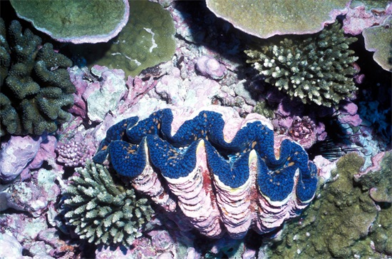 在海里生活的砗磲,当潮水涨满把它淹没时,便张开贝壳,伸出肥厚的外套膜边缘进行活动。它们的外套膜极为绚丽多彩,不仅有孔雀蓝、粉红、翠绿、棕红等鲜艳的颜色,而且还常有各色的花纹。