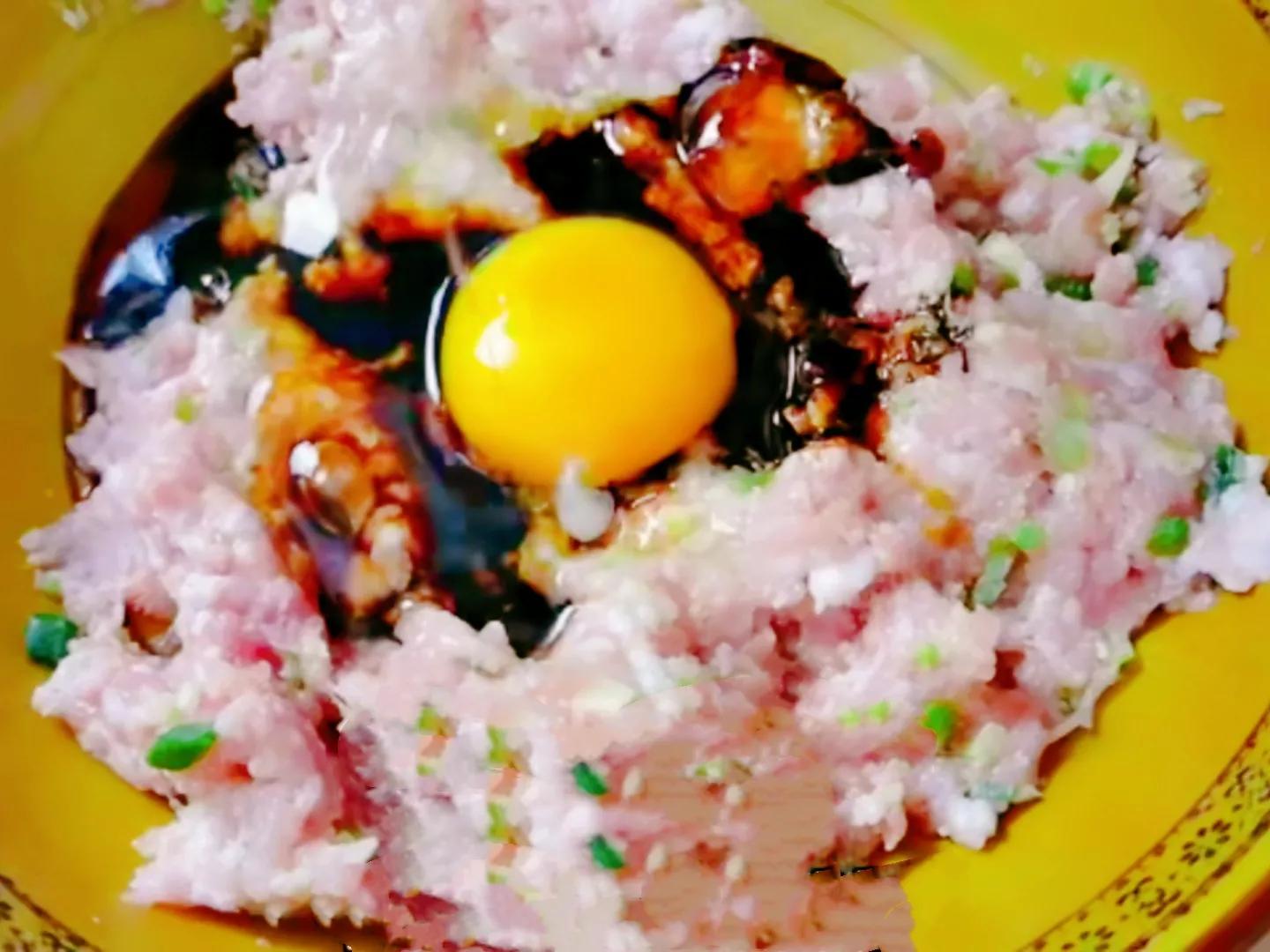 4.五花肉先去皮,然后切成小块,再剁成肉沫,加入食盐、鸡蛋、酱油、葱花、胡椒粉搅拌均匀,最后把荠菜放入肉中搅拌均匀。