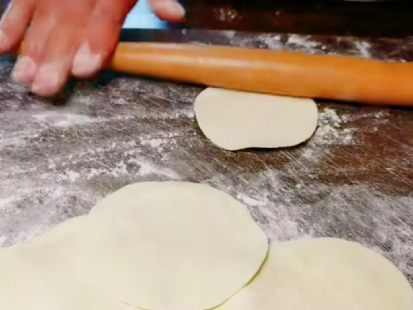 5.饧发好的面团揉面再搓成条状,分成小面剂子,用擀面杖擀成圆形水饺皮。