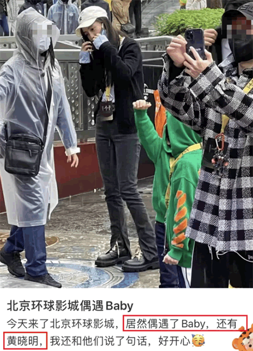 不过早前曾有网友发贴称偶遇杨颖与黄晓明带孩子现身游乐园,当天baby打扮低调,小海绵身穿绿色卫衣乖巧站在一旁,虽然照片中并未有黄晓明身影出现,但是网友特意表示自己看见了他,还与夫妻二人对话过。
