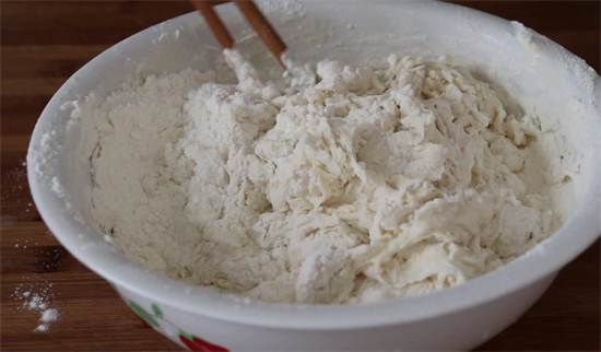 3、对于任何面食来说,和面都是尤为重要的。将准备好的300克面粉放到一个大一点的碗中,然后将酵母水倒入到面粉中。为了让面粉和得更加充分更加均匀,咱们需要多次少量地往面粉中倒酵母水。