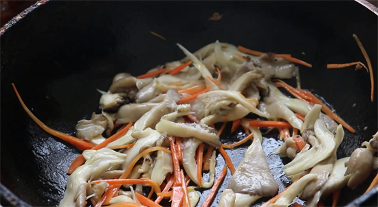 5、先看一下锅中的油是否足够,如果足够的话就不用再加油了,如果不够的话就再加入适量的食用油。先将食用油烧热,再放入大蒜片炒出香味,接着咱们将胡萝卜丝放进去翻炒一下,一直炒到胡萝卜丝断生,然后再放入平菇继续翻炒。