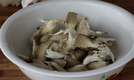 2、平菇先撕成小朵,要稍微小一点,把撕好的小朵放到大碗中,然后倒入清水,接着加上适量的食用盐,将平菇清洗一遍,这样就可以将平菇清洗得很干净了,平菇清洗完之后先将它放到一旁,然后用食用盐水浸泡一小会。
