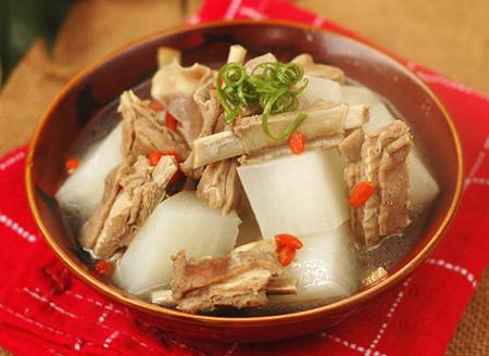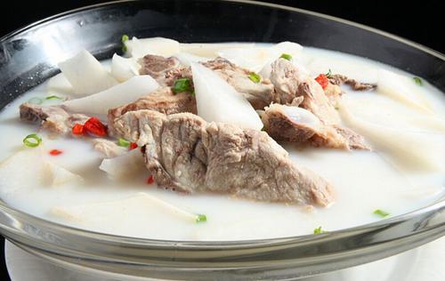 3、接着锅中烧水,将羊排冷水下锅,再放入料酒少许,将其焯水三分钟后,捞出冲凉水备用。接着净锅加入少许清水,将焯水后的羊排放入锅内,然后再将包裹着料头的布包,放入锅内。开中火,将羊排炖至40分钟,35分钟后,将白萝卜放入锅内,再炖五分钟即可出锅装盘成菜。