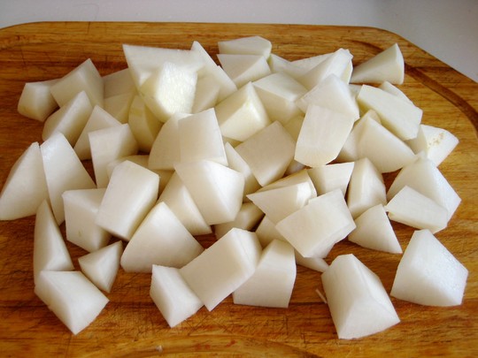 2、这一步是重点,大家请仔细阅读。接着利用这十分钟咱们准备配料和料头,首先将白萝卜一根,洗净后去根,然后一分为四,切成滚刀块备用。接着准备煲鱼袋一个,也就是可以放料头的布包,将洋葱一个,切块后放入其中,然后再往里面放入少许的白芷,姜片,花椒等料头备用。洋葱是羊肉膻味的天敌,不管用羊肉做什么,只需要加入少许的洋葱,膻味立马会减去很多,这一点大家要牢记。