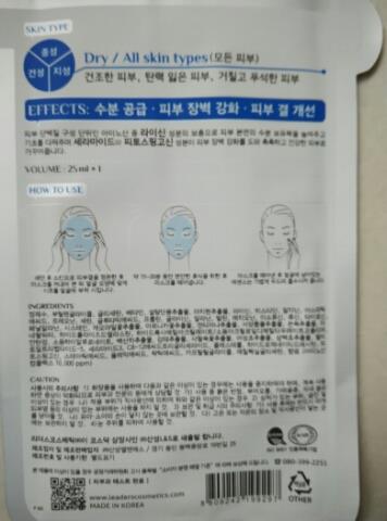 很意外能免费试用这款面膜,平常也用但是韩国的还是第一次用,我皮肤属于中干性,我在北方皮肤很干燥,每天都要用可多精华液,每天只要做好保水就可以了,这款看说明就很适合我,每天晚上先用洗面乳把脸洗干净,再抹一边水,再用一层薄薄的精华液,最后就是要用这款面膜了,精华液,这是正面的包装。