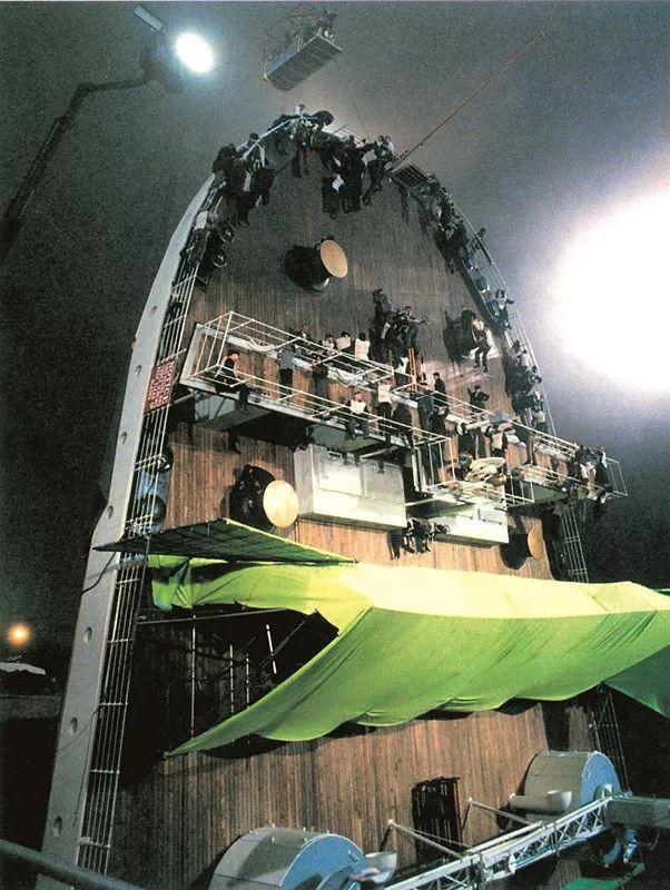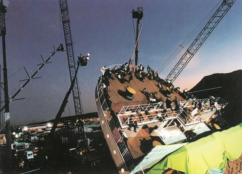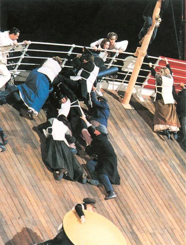 有一个镜头是这样的:船尾慢慢翘起,此时1500个演员加上工作人员要顺着逐渐倾斜坡路向倾覆的船尾跑去。