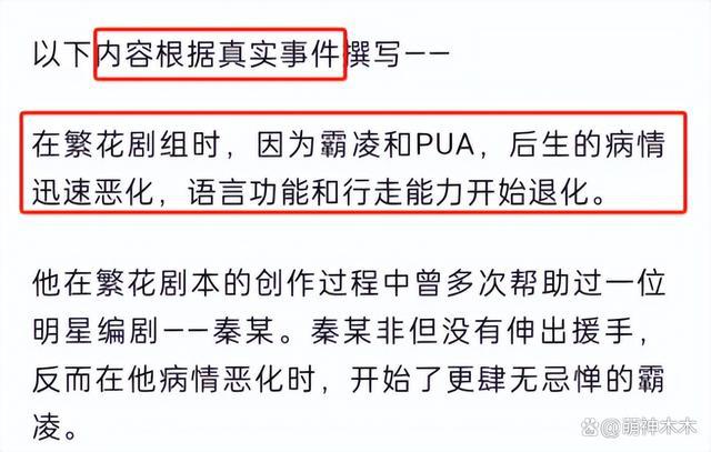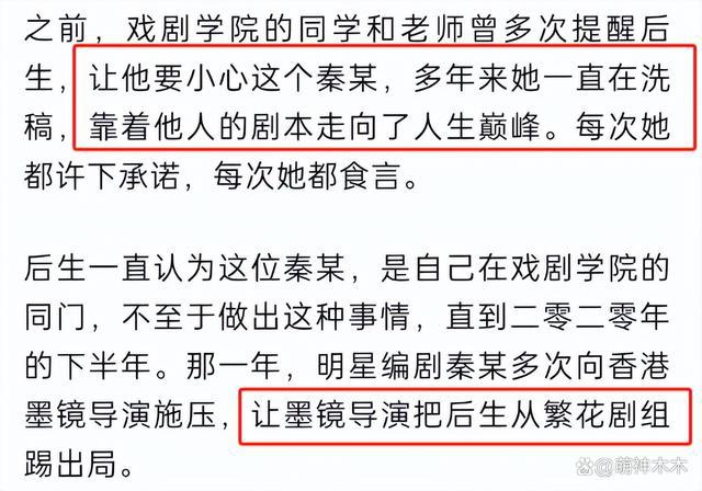 作品被剥夺完毕后,继续被打压,秦某、徐某某等人经常在导演耳边诋毁他的人品和工作能力,导演默认这一事实。每当剧本翻车,又会让作者好好写,秦某、徐某某则继续羞辱他,不限于 " 对待下等人,你就不能把他当人看 " 等恶劣说辞,还会利用他帮导演购买零食在经费上捉弄他。导演向男主演介绍他的时候,也含糊不清,从该作者的整个内容看,剧组氛围并不太好,充斥着鄙视链。