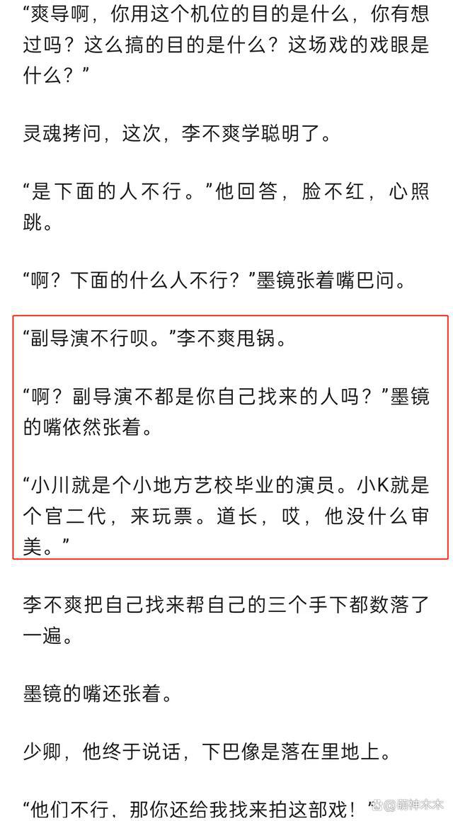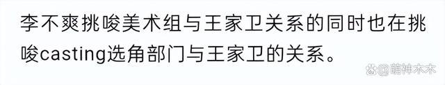 作者在《繁花》剧组经历的多,看到的更多,处处都是欺压,都想着把人斗走,自己能多分一杯羹。比如作者提到的张艺谋徒弟,香港大姐大,还有不少没有具名的关系户。而一个张艺谋徒弟李不爽足够把剧组搅合的乱糟糟,可怕的是王家卫拿他也没有办法。
