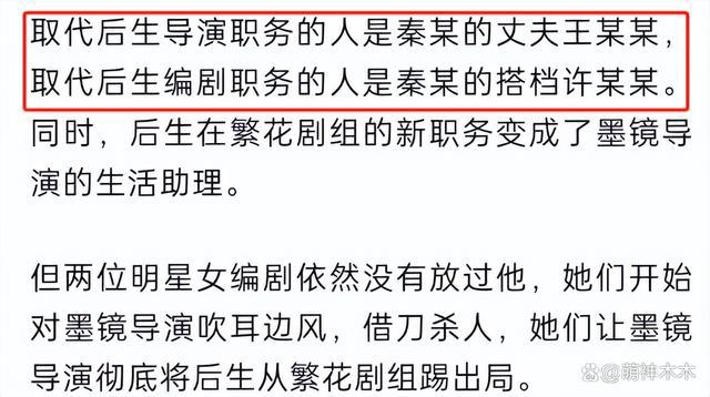 而后,秦某的丈夫给作者挖坑,公开场合诋毁作者抢占功劳,称剧本都是秦某熬夜写的。暗地里威胁作者交出所有剧本,待剧本全部交给秦某后,作者剧组导演及编剧两项职务被解除,原因是擅自修改了剧本台词。之后秦某丈夫王某取代导演职务,秦某搭档取代编剧职务,作者降级成为导演的生活助理。