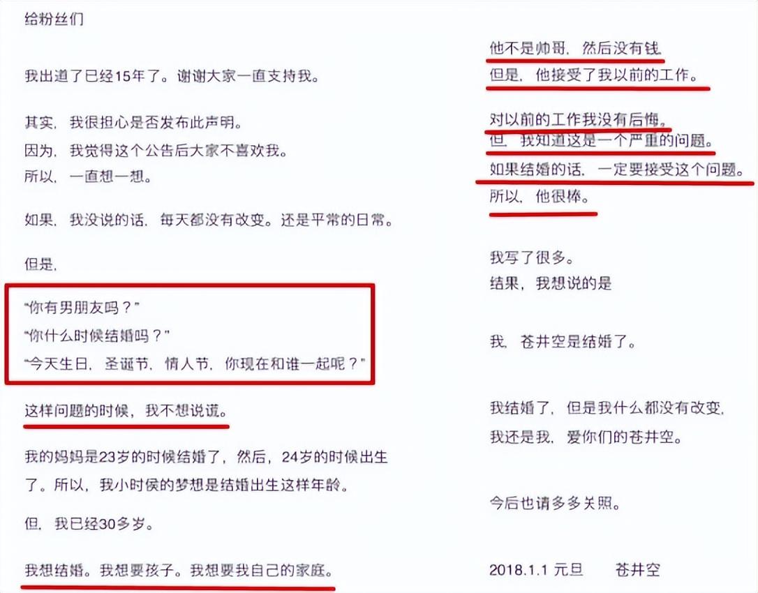 2018年,1月1日,苍井空在社交媒体上大方向粉丝们官宣了自己结婚的消息,并晒出了一张手上戴婚戒的照片。