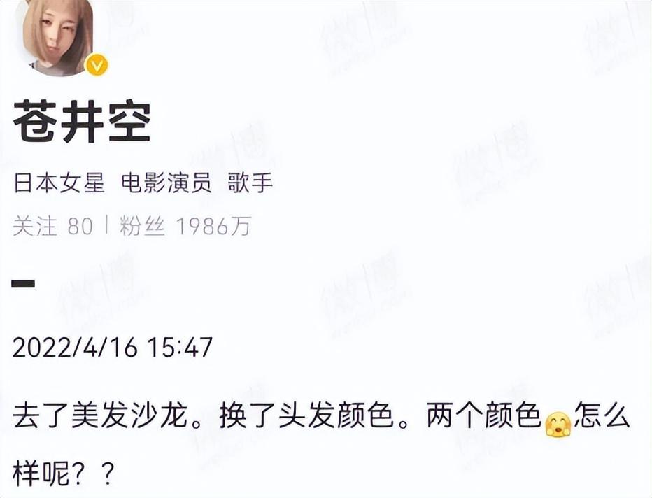 能看出,如今的苍井空生活十分幸福惬意,所以也会经常分享自己的幸福日常,前段时间,苍井空还向粉丝们晒出自己的新发型,对着镜头嘟嘴卖萌,十分地可爱。