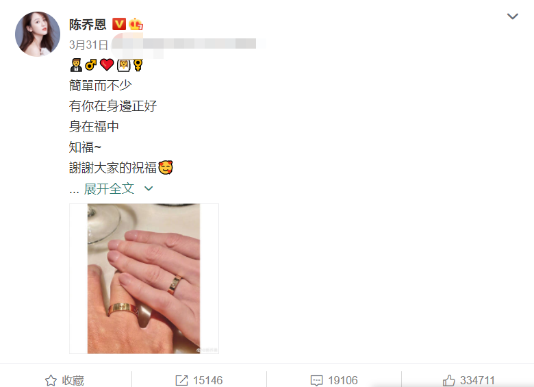 本以为恋爱后一直都很低调的陈乔恩,不会很快回应这件事情,不曾想的是,在被爆料领证没多久,作为当事人的她也大方回应了网友们的猜测,晒出了自己跟艾伦两人的婚戒 ,官宣了自己结婚的消息,并且还感谢网友们的祝福。