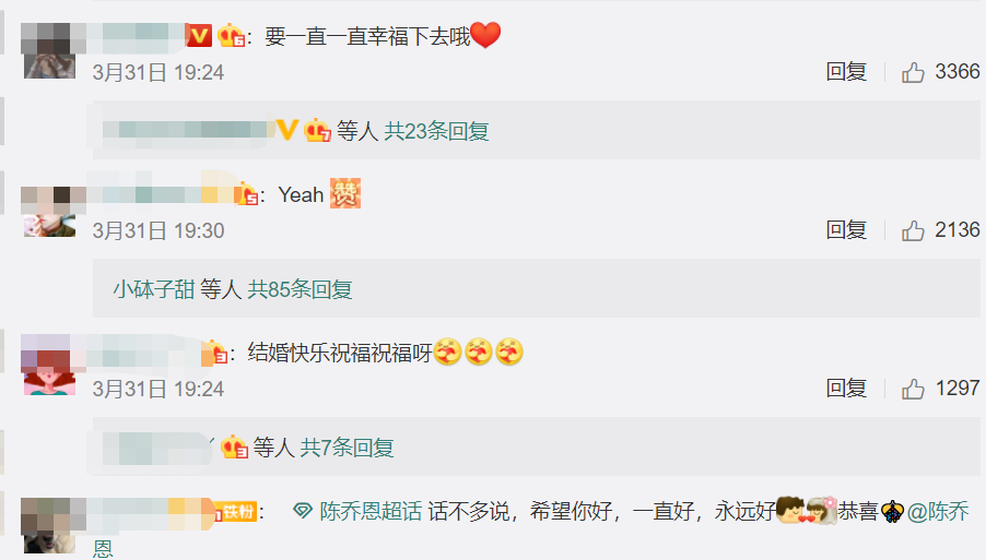 陈乔恩官宣结婚后,她的评论区也几乎都被粉丝给霸屏了,大家都在说恭喜,都在为她踏入了人生的另一个阶段而开心。