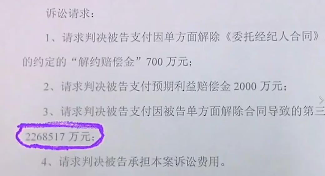跨年演唱会“落跑”之后,陈楚生单方面宣布解约。天娱传媒怒气冲天,一纸诉状将陈楚生告上法庭,要求陈楚生赔偿巨额违约金227亿!