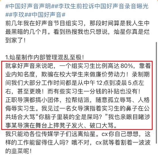 此外,一位曾在好声音节目组任职过的实习生也发帖曝光,声称自己几年前在好声音节目组的实习经历是人生中最为黑暗的几个月,指出好声音节目组欺骗在校大学生做廉价劳动力,一个组的实习生比例竟然高达80%。