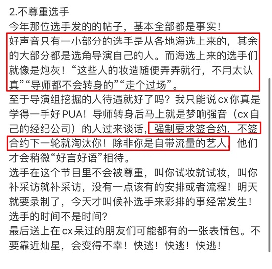 至于导演组挖掘到的人才,经纪公司直接强制要求签合约,如果不签合约下一轮就淘汰你,除非你是自带流量的艺人,实习生与徐海星的爆料基本吻合。