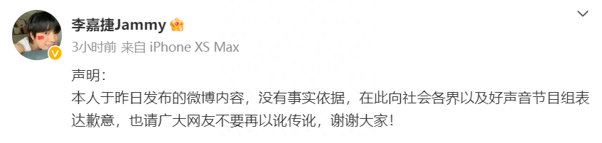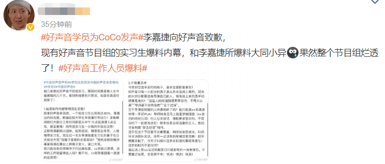 为李玟发声的学员李嘉捷已公开道歉,前后仅仅16个小时,不知道是不是节目组的操作。